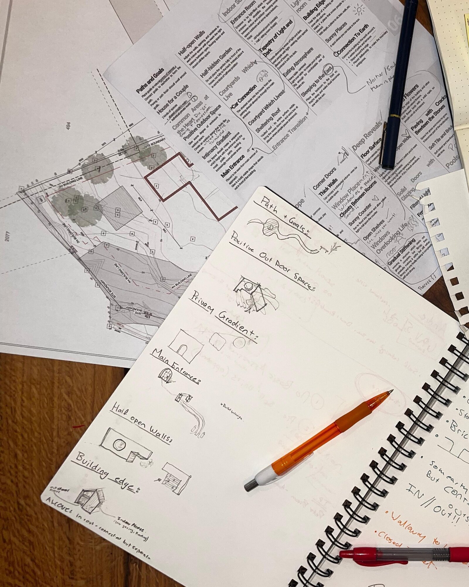 Penny and her team are now turning these into higher fidelity plans + 3D drawings. I’m quite curious to see how the rockface, the smallness of the house, and these early patterns start to show up in those.