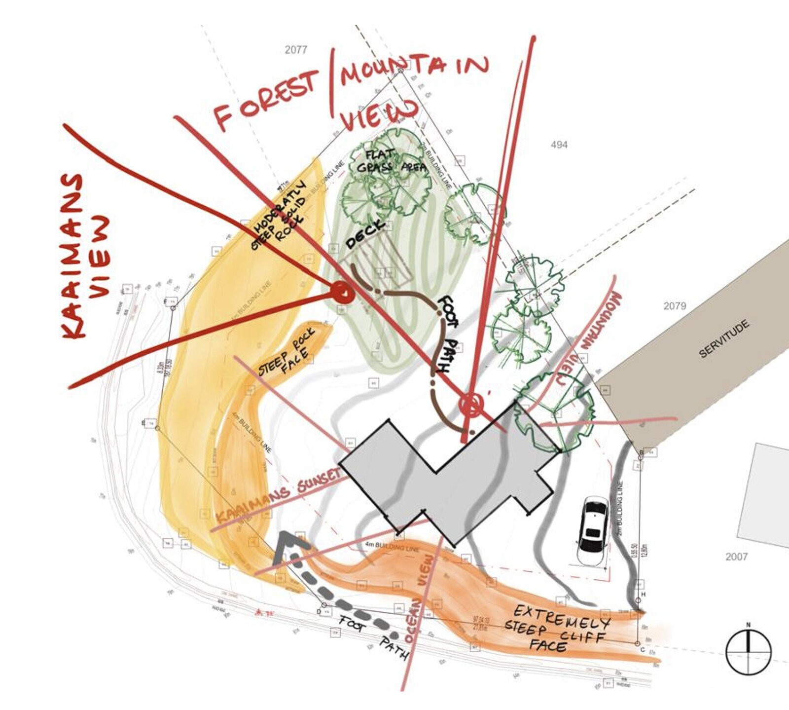 You’ll also notice that we’re already considering the role of the slope and contours and how they create a sense of feeling. The slope naturally has an effect on the height of ceilings, terraces and walkways, which in turn affects how you move through the place and where the private and public spaces are.